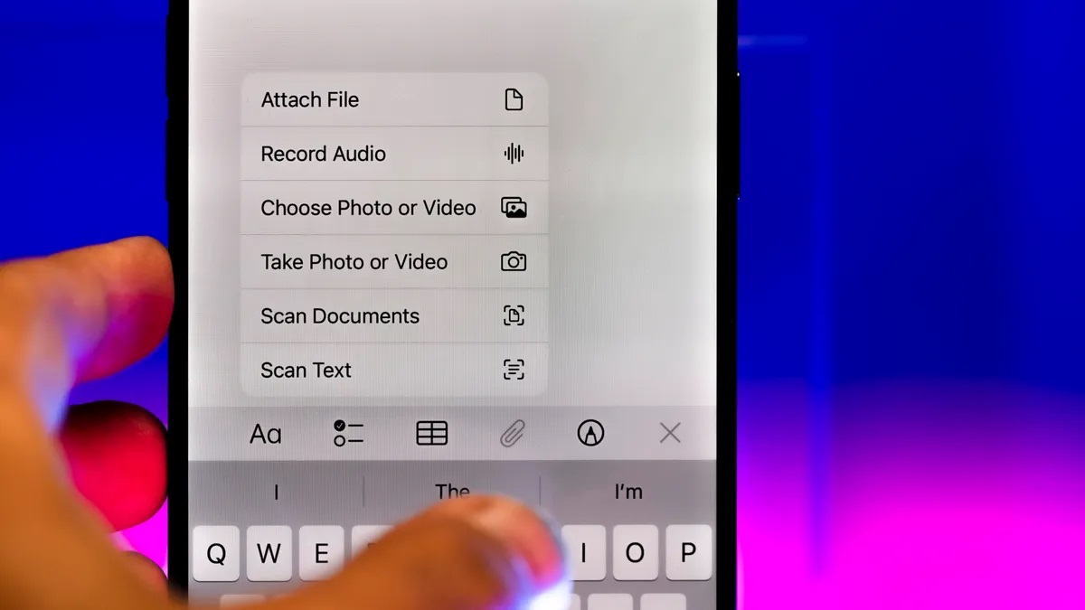 Σε εκδόσεις iOS 17 και παλαιότερες, πατήστε το κουμπί Κάμερα στην κάτω μεριά της οθόνης (ή αν επεξεργάζεστε μια σημείωση, το ίδιο εικονίδιο θα είναι πάνω από το πληκτρολόγιο) και πατήστε Σάρωση Εγγράφων. Αν είστε σε iOS 18, αντί για το εικονίδιο Κάμερας, θα πατήσετε το κουμπί Συνημμένα (εικονίδιο συρραπτικού) και επίσης θα πατήσετε Σάρωση Εγγράφων.