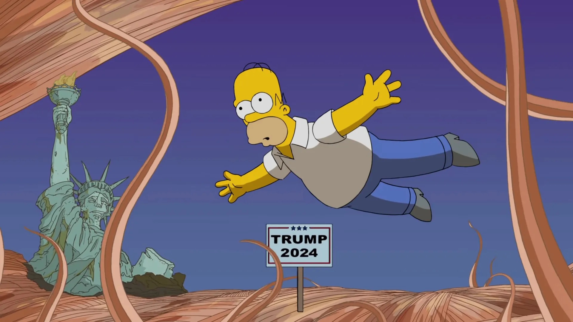Είναι ήδη γνωστό ότι η σειρά προέβλεψε την προεδρία του Τραμπ το 2000. Αλλά αξίζει επίσης να σημειωθεί ότι το 2015, οι Simpsons προέβλεψαν ότι ο Τραμπ θα ήταν ξανά υποψήφιος στις εκλογές του 2024. Στο σύντομο βίντεο από το επεισόδιο «Trumptastic Voyage», ο Homerκάνει ένα σουρεαλιστικό ταξίδι στα μαλλιά του Τραμπ, όπου οι θεατές μπορούν να δουν μια  προεκλογική πινακίδα που γράφει, “Trump 2024”.
