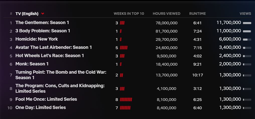 «Το πρόβλημα των 3 Σωμάτων» έχει μπει στη λίστα του εβδομαδιαίου Top 10 με τις κορυφαίες τηλεοπτικές σειρές (στα αγγλικά) που έχουν τις περισσότερες προβολές, και βρίσκεται στη δεύτερη θέση με 11.000.000 προβολές και 81.7000.000 ώρες προβολών μέχρι στιγμής.