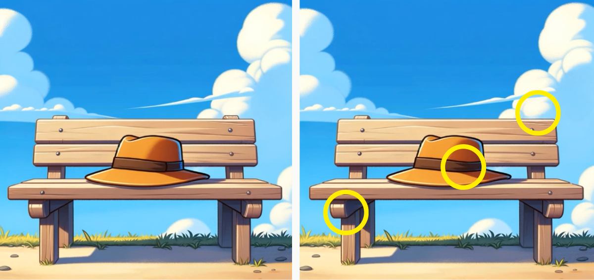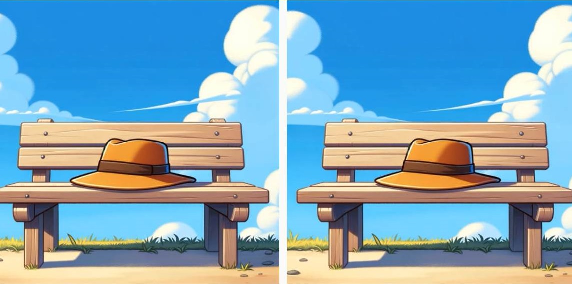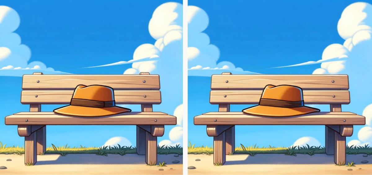 Η παρακάτω εικόνα απεικονίζει δύο πανομοιότυπες εικόνες δίπλα-δίπλα, όπου μπορείτε να δείτε ένα καπέλο σε ένα παγκάκι. Παρόλο που οι δύο εικόνες είναι σχεδόν πανομοιότυπες, υπάρχουν 3 διαφορές μεταξύ τους.