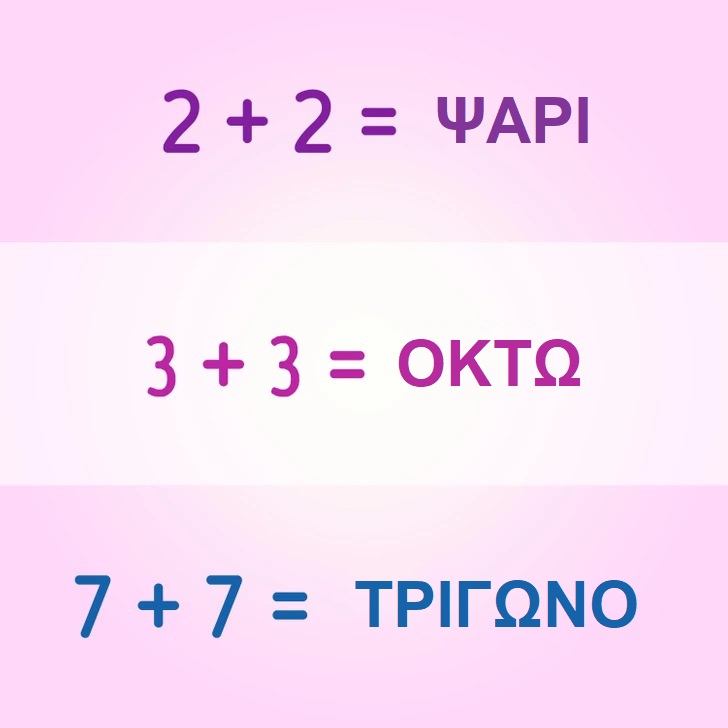 Στην εικόνα, μπορούμε να δούμε τρεις ισότητες, «2 + 2 = ΨΑΡΙ», «3 + 3 = ΟΚΤΩ» και «7 + 7 = ΤΡΟΓΩΝΟ». Η πρόκληση για τους αναγνώστες είναι να καταλάβουν πώς γίνεται να ισχύουν αυτές οι ισότητες σε 9 δευτερόλεπτα.