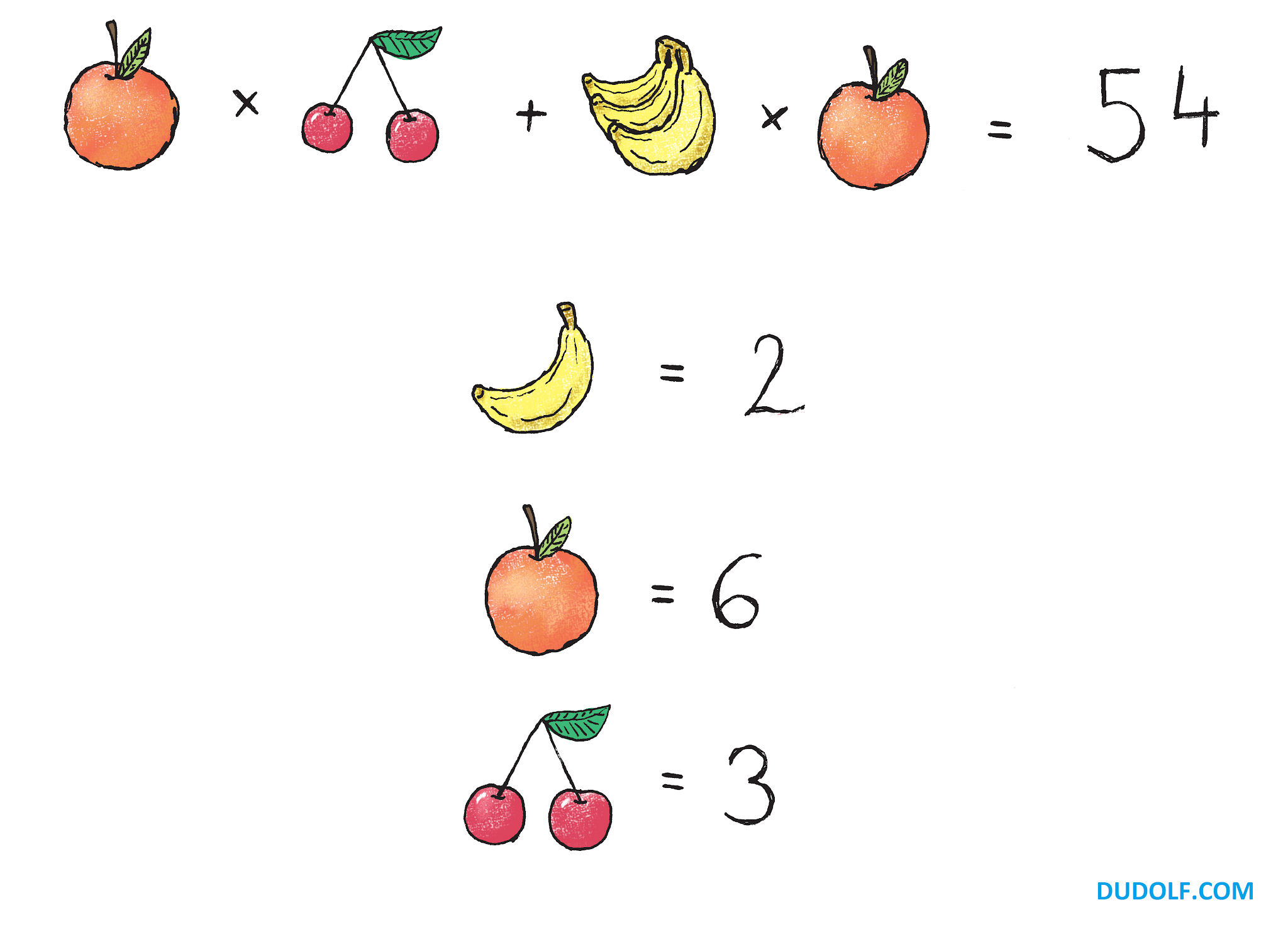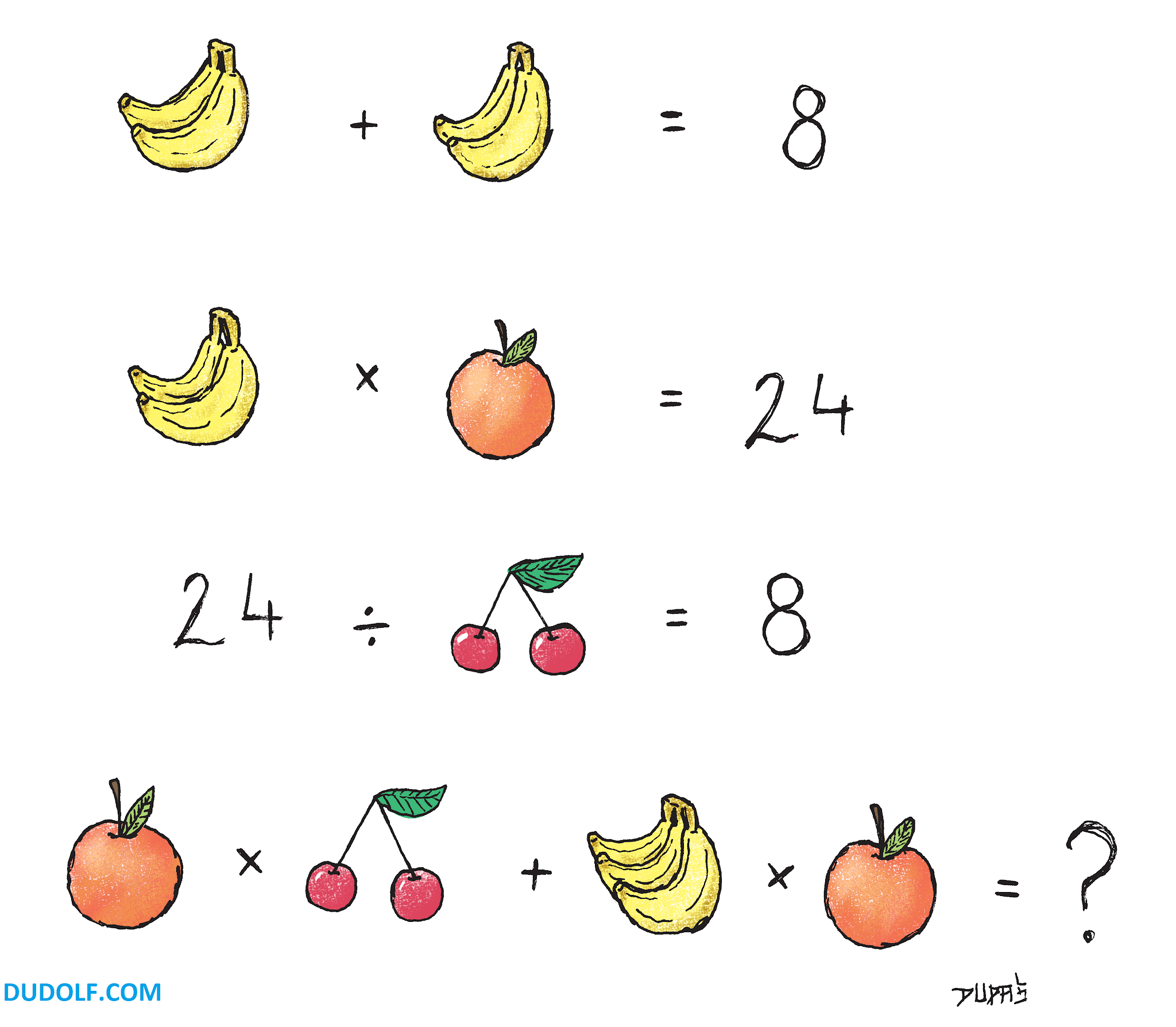 Ένας γραφίστας δοκιμάζει τις γνώσεις μας στην άλγεβρα και τις δεξιότητές μας στον εντοπισμό των διαφορών, με ένα μαθηματικό πρόβλημα στο οποίο συγκεκριμένοι αριθμοί αντιστοιχούν σε διαφορετικά φρούτα.