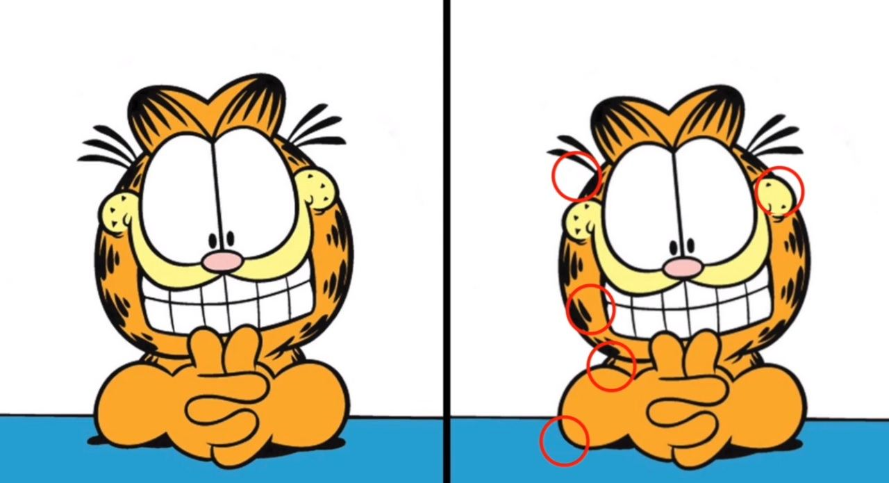 Το συγκεκριμένο τεστ παρατηρητικότητας παρουσιάζει δύο πανομοιότυπες εικόνες με τον Garfield . Οι εικόνες φαίνονται σχεδόν ίδιες, αλλά υπάρχουν πέντε διαφορές μεταξύ τους. Το 99,9% των ανθρώπων δεν κατάφερε να βρει και τις πέντε μέσα σε τόσο λίγο χρόνο. Χρησιμοποιήστε την ικανότητά σας να σκέφτεστε κριτικά, να συγκεντρώνεστε και να παρατηρείτε όλες τις λεπτομέρειες, ακόμη και τις παραμικρές.