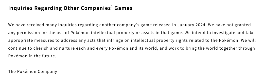 «Έχουμε λάβει πολλές ερωτήσεις σχετικά με το παιχνίδι μιας άλλης εταιρίας που κυκλοφόρησε τον Ιανουάριο του 2024. Δεν έχουμε χορηγήσει καμία άδεια για τη χρήση της πνευματικής ιδιοκτησίας ή των περιουσιακών στοιχείων των Pokémon σε αυτό το παιχνίδι. Σκοπεύουμε να ερευνήσουμε το θέμα και να λάβουμε τα κατάλληλα μέτρα για να αντιμετωπίσουμε τυχόν πράξεις που παραβιάζουν τα δικαιώματα πνευματικής ιδιοκτησίας που σχετίζονται με τα Pokémon. Θα συνεχίσουμε να αγαπάμε και να προστατεύουμε κάθε Pokémon και τον κόσμο τους και θα εργαστούμε για να ενώσουμε τον κόσμο μέσω των Pokémon στο μέλλον» -The Pokémon Company.