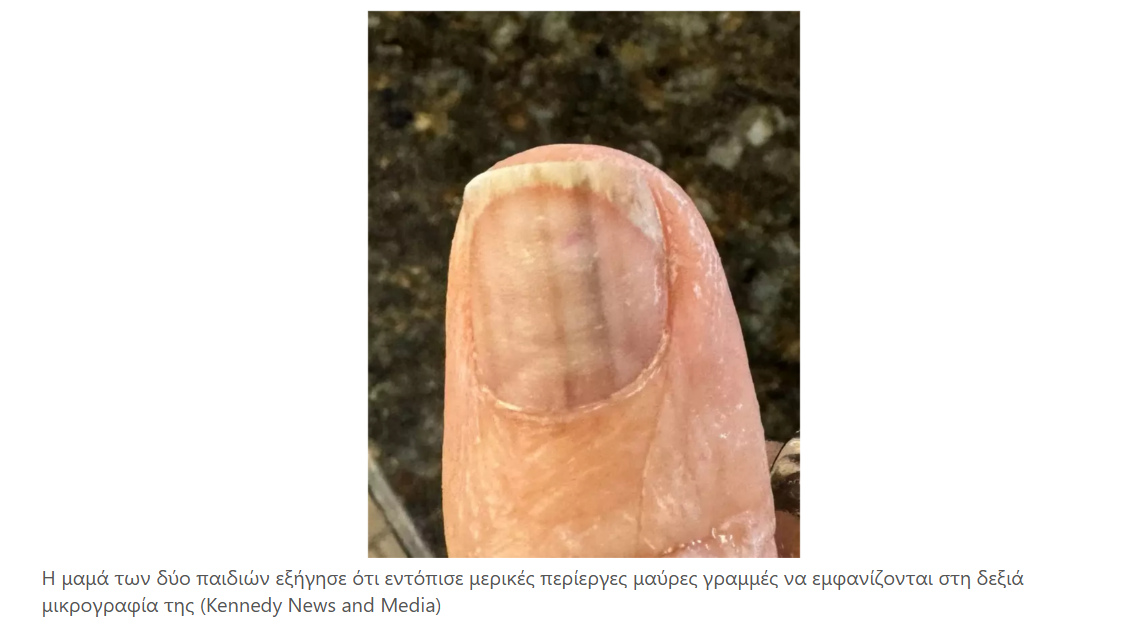 «Ο δερματολόγος έβλεπε αποχρωματισμό στη βάση του νυχιού μου και ό,τι προκαλούσε αυτή τη μαύρη γραμμή προερχόταν από την πλάκα ανάπτυξης, από μέσα στο νύχι μου».