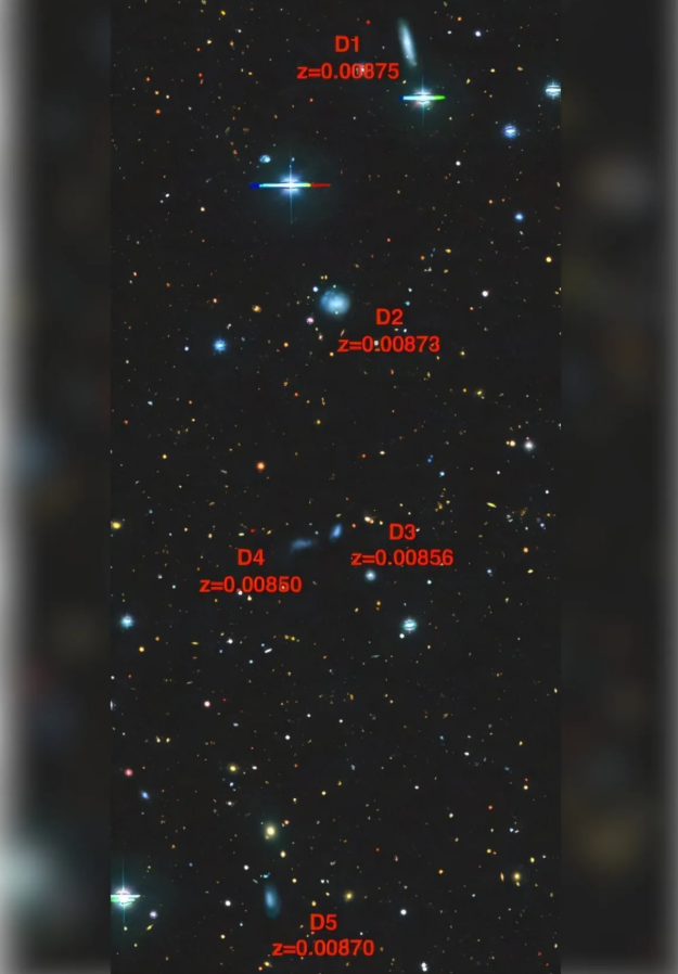 Αυτοί οι γαλαξίες, που ονομάστηκαν D1 έως D5, συγκρατούνται από την αμοιβαία βαρύτητά τους. Ορισμένοι συμμετέχουν σε έναν «ρυθμικό χορό», ενώ άλλοι βρίσκονται σε μια «κοσμική διαμάχη», αφαιρώντας αέριο και αστέρια ο ένας από τον άλλον.