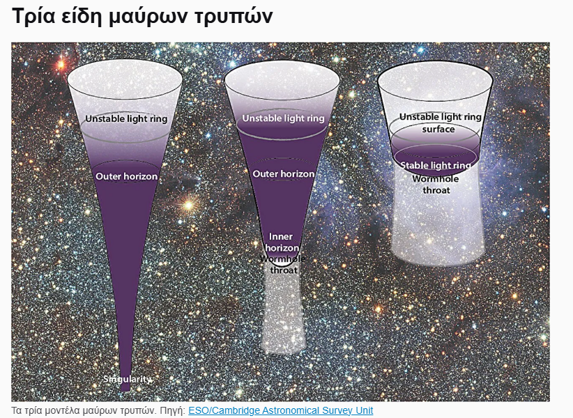 Η ομάδα του IFPU συζητά ένα παλιό και δύο νέα μοντέλα μαύρων τρυπών. Το πρώτο είναι το κλασικό μοντέλο μαύρης τρύπας που συνοδεύεται από έναν ορίζοντα γεγονότων και μια μοναδικότητα. Τα άλλα δύο είναι οι «κανονικές μαύρες τρύπες» και ένας «μιμητής μαύρης τρύπας» που λειτουργεί χωρίς μοναδικότητα.