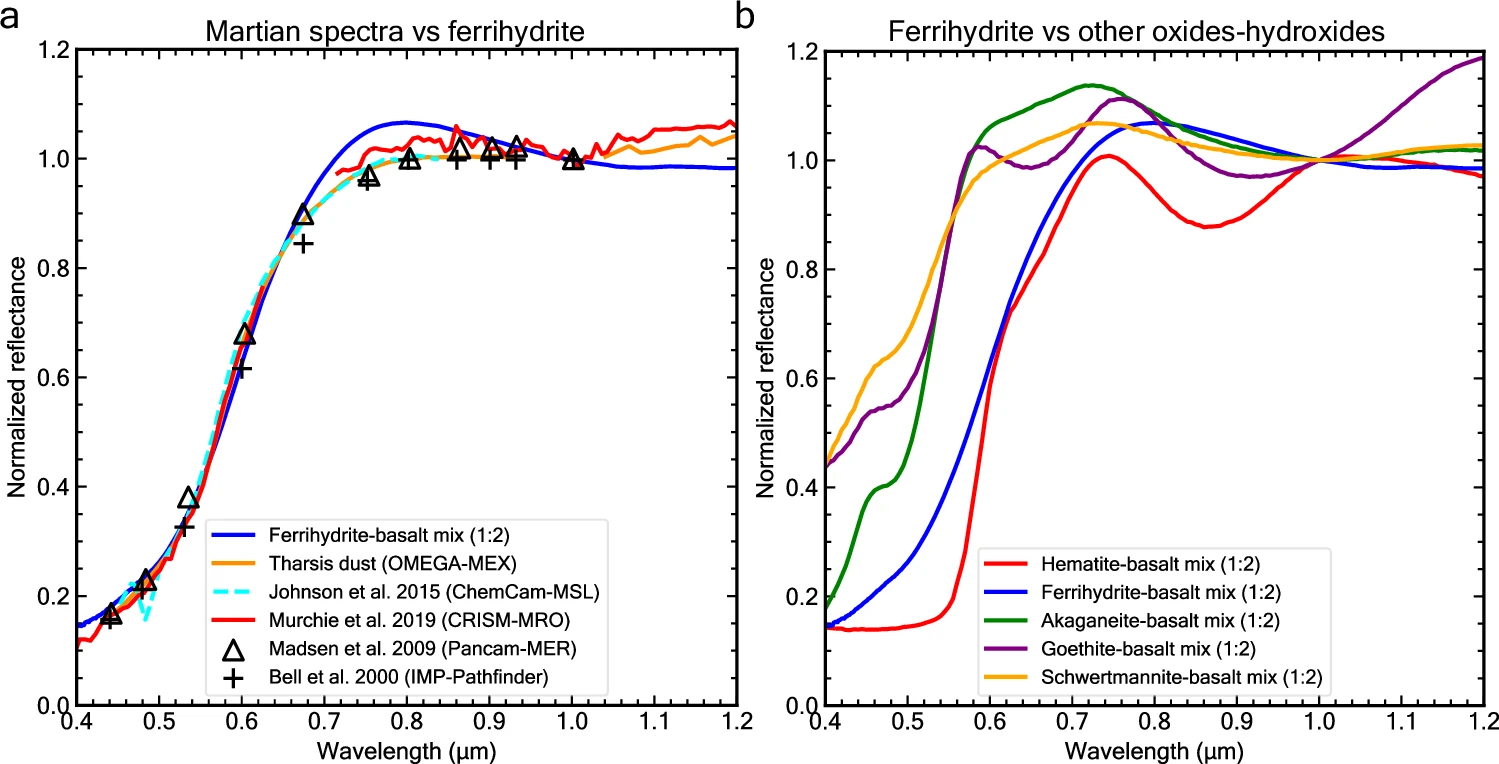 Εδώ αναδεικνύεται ότι ο κρυσταλλικός φερριϋδρίτης (Fe 5 O 8 H · nH 2 O) είναι η κυρίαρχη φάση που φέρει οξείδιο του σιδήρου στην αρειανή σκόνη, με βάση συνδυασμένες αναλύσεις τροχιακών, επιτόπιων και εργαστηριακών ορατών φασμάτων κοντά στο υπέρυθρο.
