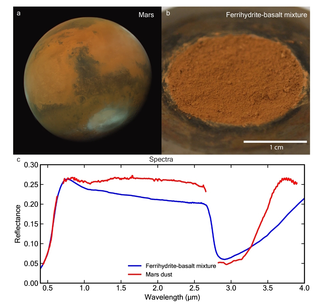 «Δημιουργήσαμε ένα αντίγραφο της αρειανής σκόνης χρησιμοποιώντας διάφορους τύπους σιδηρούχων οξειδίων και διαπιστώσαμε ότι ο φερριυδρίτης αναμειγμένος με βασάλτη ταιριάζει καλύτερα με τα ορυκτά που παρατηρούνται από τα διαστημικά σκάφη», δηλώνει ο επικεφαλής συγγραφέας της μελέτης.
