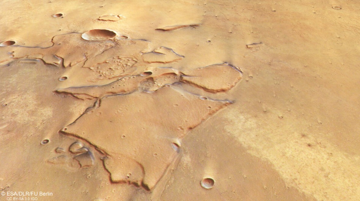 Η εικόνα του Mars Express καταγράφει επίσης απότομες, επίπεδες κορυφές – παρυφές ύψους άνω του ενός χιλιομέτρου – με σκούρα εκτεθειμένα στρώματα που μαρτυρούν αρχαίες ροές λάβας ή τέφρας.