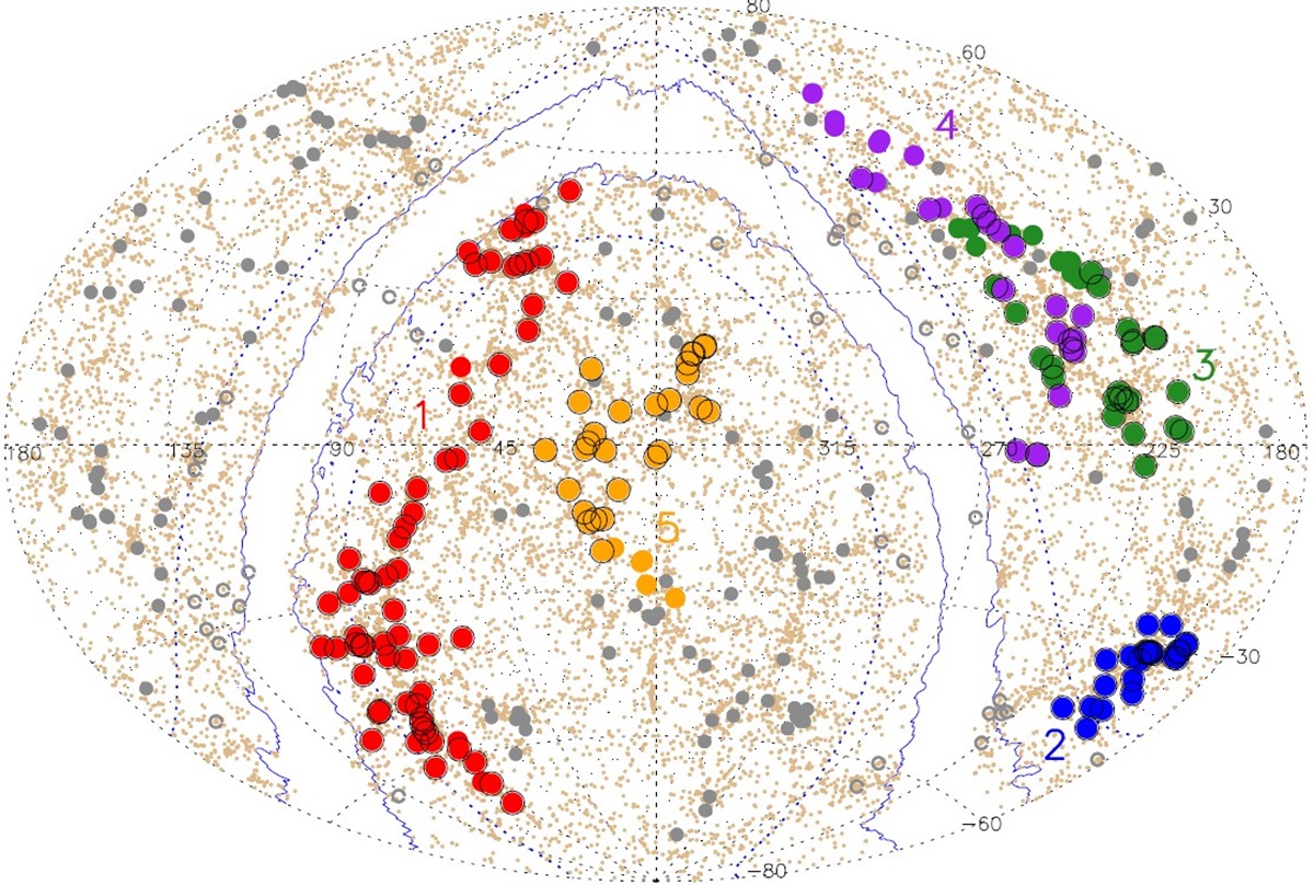 Χάρτης που δείχνει τις πέντε κοσμικές υπερδομές: Quipu (κόκκινο), Ηρακλής (μωβ), Serpens-Corona Borealis (πράσινο), Sculptor-Pegasus (πορτοκαλί) και Shapley (μπλε) / πηγή:Böhringer et al.