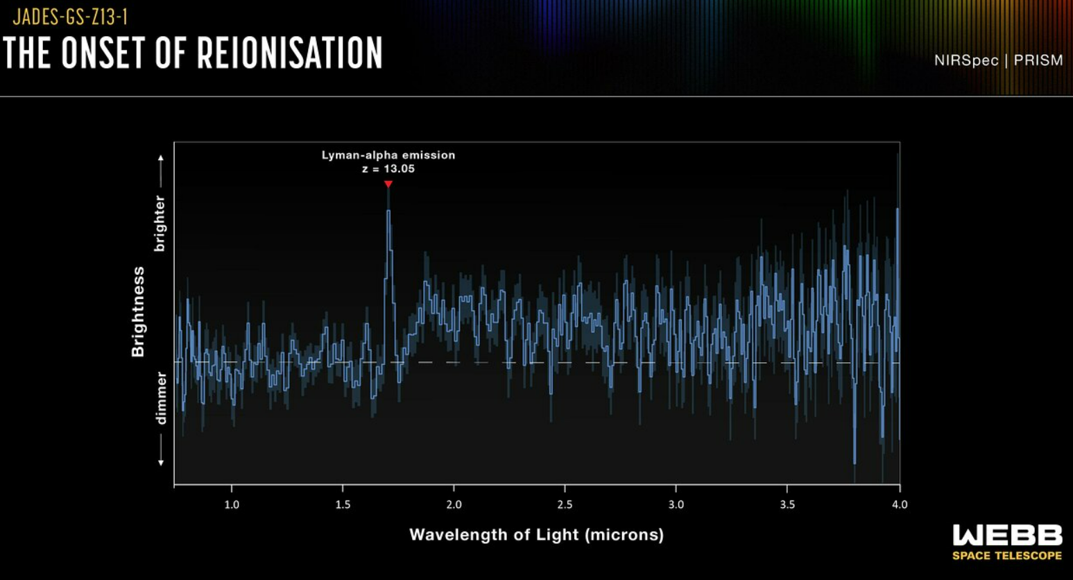 Ο γαλαξίας GS-z13-1 παρατηρείται όταν το σύμπαν είχε μόλις 330 εκατομμύρια χρόνια, και παρόλα αυτά δείχνει μια εκπληκτικά καθαρή υπογραφή εκπομπής Lyman-alpha, που μπορεί να φανεί μόνο αφού η γύρω ομίχλη έχει απομακρυνθεί πλήρως. Αυτό το αποτέλεσμα ήταν εντελώς απρόσμενο από τις θεωρίες για τον πρώιμο σχηματισμό των γαλαξιών και έχει εκπλήξει τους αστρονόμους».