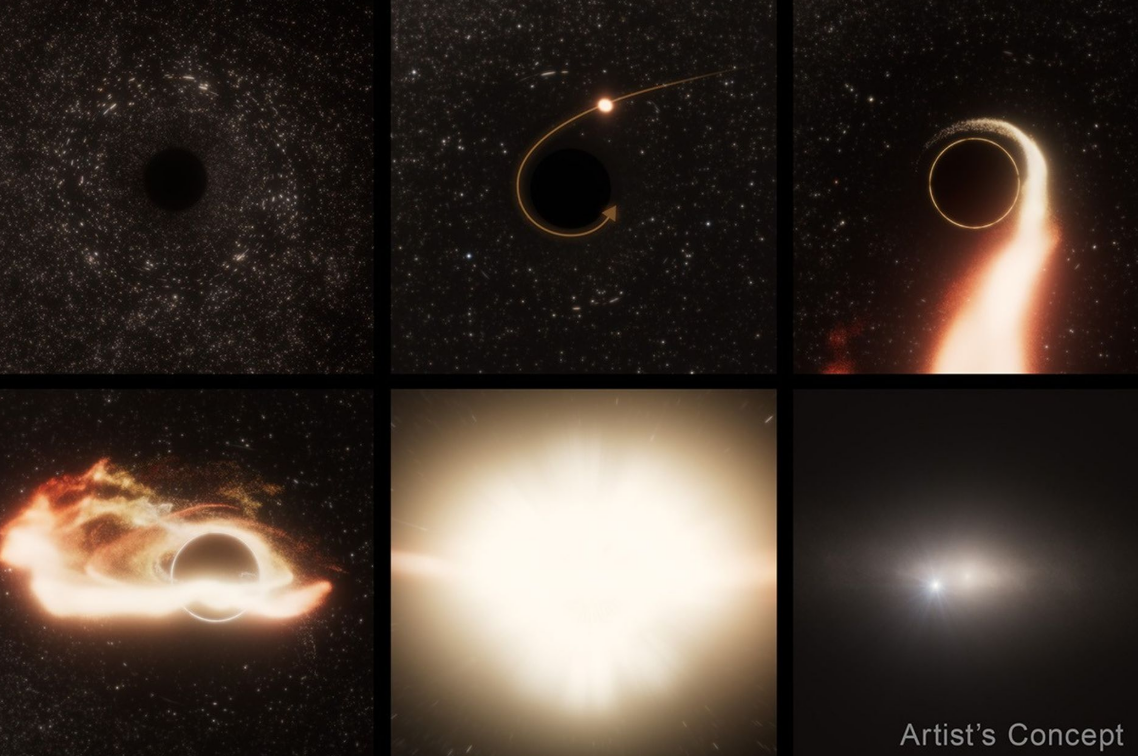 Η εικόνα αποτελείται από έξι τμήματα, με το επάνω αριστερά να δείχνει την σκιά μιας υπερμεγέθους μαύρης τρύπας που περιφέρεται μέσα σε γαλαξία. Το μεσαίο πάνω τμήμα παρουσιάζει ένα κίτρινο αστέρι που περνά κοντά στη μαύρη τρύπα. Τα τρία επόμενα δείχνουν το αστέρι να διασπάται σε λαμπερά λευκά ρεύματα και να εκρήγνυται, ενώ το κάτω δεξιά τμήμα απεικονίζει την εικόνα μιας γαλαξιακής δομής με ένα λαμπερό αστέρι-σημείο που αντιστοιχεί στη θέση της έκρηξης, όπως φαίνεται σε ακτίνες Χ και ορατό φως.