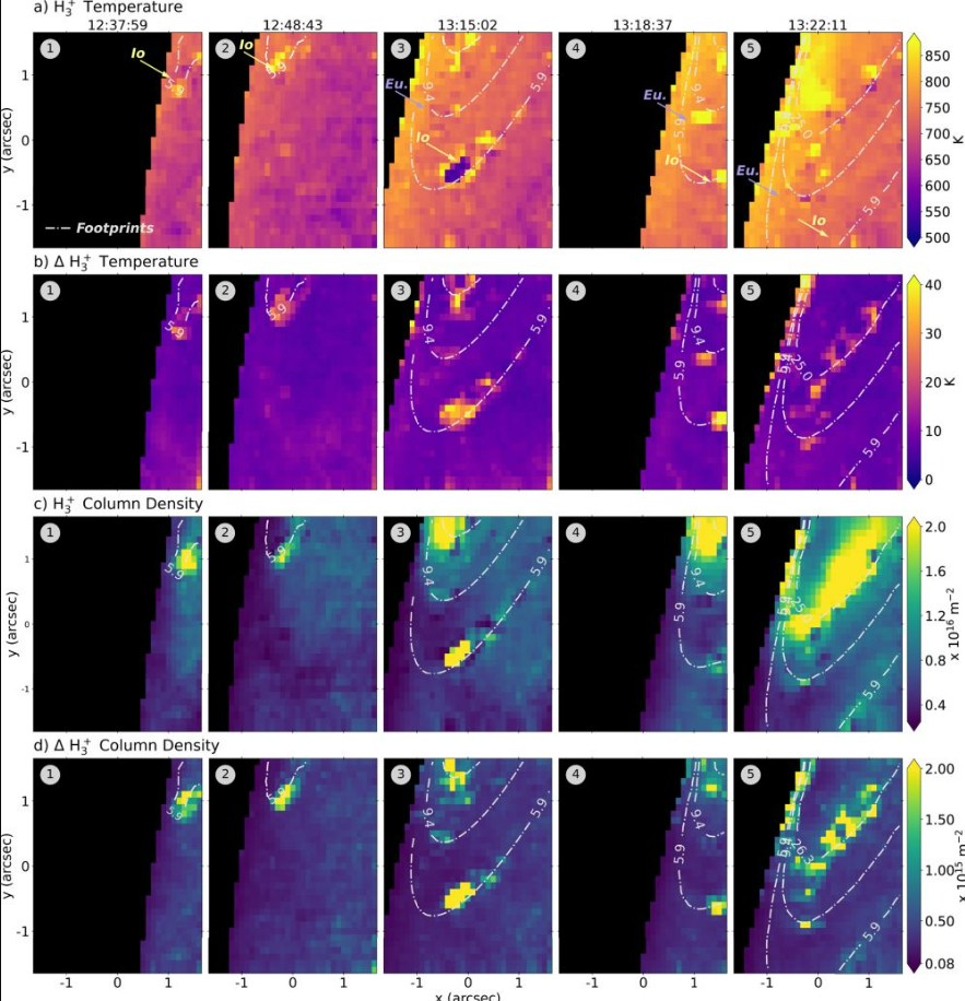 Νέα έρευνα που δημοσιεύτηκε στο «Geophysical Research Letters» παρουσιάζει τις πρώτες φασματικές μετρήσεις των υπέρυθρων φωτεινών σημείων στο σέλας του Δία. Η μελέτη, με επικεφαλής την Katie Knowles, χρησιμοποίησε το τηλεσκόπιο James Webb (JWST) για να αναλύσει τη μεταβλητότητα των «αποτυπωμάτων» που αφήνουν οι δορυφόροι του πλανήτη.