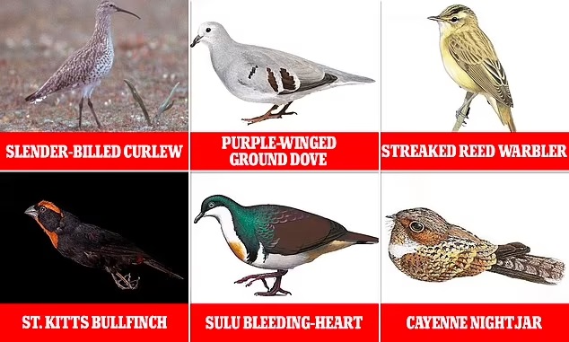Ανάμεσά τους βρίσκονται σπάνιες ομορφιές, όπως το μωβ φτερωτό περιστέρι, η ραβδωτή τσούχα και ο «σιδεράς του βουνού». Εν τω μεταξύ, η λεπτομύτα – η μόνη που υπάρχει στον κατάλογο και εντοπίζεται στην Ευρώπη – δεν έχει εξακριβωθεί ότι έχει εντοπιστεί πουθενά από το 2004.