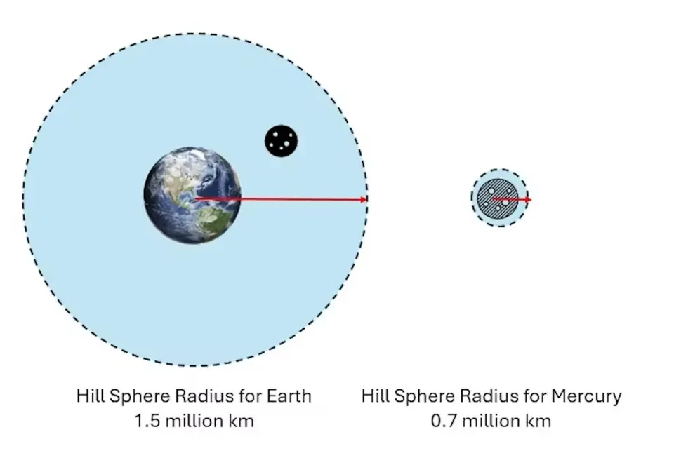 Μικρότεροι πλανήτες όπως ο Ερμής έχουν μια μικροσκοπική ακτίνα σφαίρας Hill, καθώς δεν μπορούν να ασκήσουν μεγάλη βαρυτική έλξη. Οποιαδήποτε πιθανά φεγγάρια πιθανότατα θα έλκονταν από τον Ήλιο.
