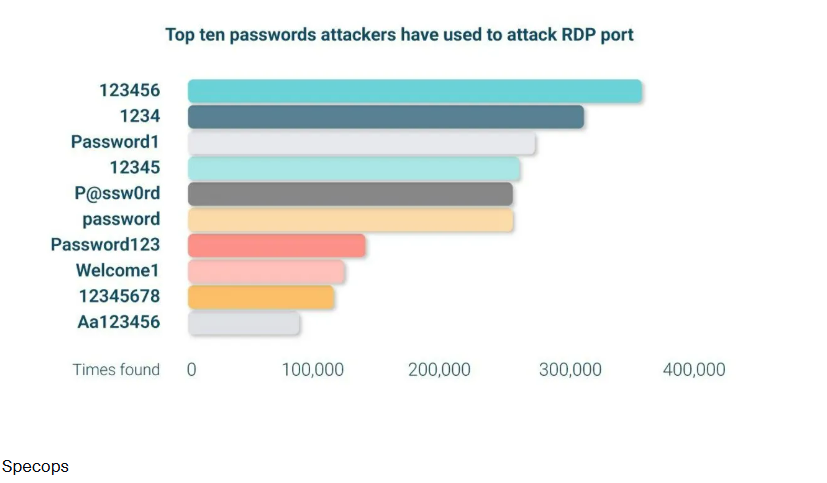 Δυστυχώς, αυτός είναι ο τομέας στον οποίο πολλοί άνθρωποι και εταιρείες αποτυγχάνουν. Σε αναφορά που δημοσιεύτηκε την Τρίτη, η εταιρεία ασφαλείας κωδικών πρόσβασης Specops αποκάλυψε τους 10 πιο συχνούς κωδικούς πρόσβασης που χρησιμοποιούν οι επιτιθέμενοι για να εκμεταλλευτούν τις συνδέσεις RDP.