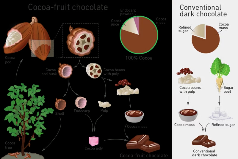 Επιστήμονες στην Ελβετία δημιούργησαν ένα νέο είδος σοκολάτας χρησιμοποιώντας περισσότερα μέρη του καρπού του κακάο. Αυτό, υποστηρίζουν, την καθιστά πιο υγιεινή και πιο βιώσιμη. Οι ερευνητές από το Ομοσπονδιακό Τεχνολογικό Ινστιτούτο ETH της Ζυρίχης, ανέπτυξαν μια νέα μέθοδο χρησιμοποιώντας τον πολτό και την εσωτερική επένδυση του φλοιού του κακάο, το ενδοκάρπιο. Το αποτέλεσμα είναι ένα «ζελέ κακάο», το οποίο είναι τόσο γλυκό που μπορεί να αντικαταστήσει τη ζάχαρη.