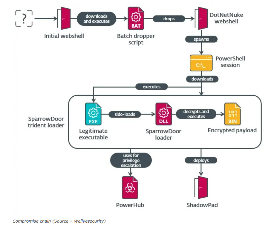 Η αλυσίδα επίθεσης ξεκινά με την ανάπτυξη webshell σε ξεπερασμένους διακομιστές IIS ή Exchange, ακολουθούμενη από την οριζόντια κίνηση και την εγκατάσταση των εξελιγμένων παραλλαγών του SparrowDoor.