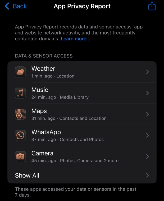 Μόλις συμπληρωθεί το App Privacy Report, θα δείτε μια λίστα με τις εφαρμογές που έχουν πρόσφατα αποκτήσει πρόσβαση σε δεδομένα ή σε έναν αισθητήρα.