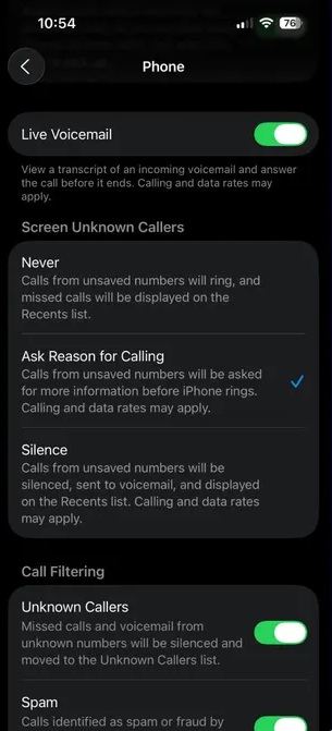 Στην ενότητα «Φιλτράρισμα άγνωστων καλούντων», θα δείτε τρεις επιλογές: «Ποτέ», «Ρωτήστε τον λόγο της κλήσης» και «Σίγαση». Ακολουθούν πληροφορίες για κάθε μία από αυτές τις επιλογές και ποια είναι η καταλληλότερη για τους περισσότερους χρήστες.