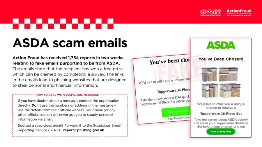 «Η Action Fraud έχει λάβει 1.754 αναφορές μέσα σε δύο εβδομάδες σχετικά με πλαστά μηνύματα ηλεκτρονικού ταχυδρομείου που υποτίθεται ότι προέρχονται από την Asda», έγραψε η Action Fraud στο X. «Οι σύνδεσμοι στα μηνύματα ηλεκτρονικού ταχυδρομείου οδηγούν σε ιστοσελίδες phishing που έχουν σχεδιαστεί για να κλέψουν προσωπικές και οικονομικές πληροφορίες».
