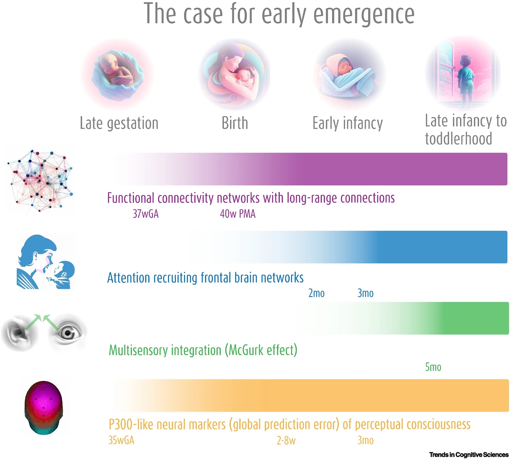 Προτείνει να εξεταστούν διάφορα αναπτυξιακά μοντέλα εμφάνισης της συνείδησης, θεωρώντας ότι ορισμένοι δείκτες μπορεί να εμφανίζονται σε ομάδες σε διαφορετικά σημεία της ανάπτυξης. Επιπλέον, προτείνει την πιθανότητα μιας συνεχούς και σταδιακής εμφάνισης ορισμένων δεικτών κατά τη διάρκεια της κύησης και της πρώιμης ζωής.