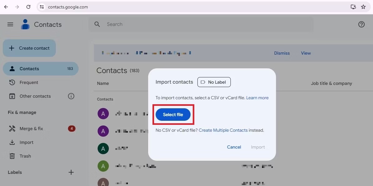 - 8. Κάντε κλικ στην επιλογή Select file (Επιλογή αρχείου) και μετακινηθείτε προς τα κάτω στο αρχείο vCard.
