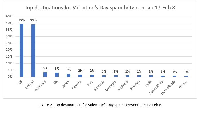 - Οι κυριότεροι προορισμοί για τα spam email για τον Άγιο Βαλεντίνο είναι οι ΗΠΑ και η Ιρλανδία, όπου η καθεμία έλαβε το 39% της αλληλογραφίας. Η Γερμανία και το Ηνωμένο Βασίλειο έλαβαν το 3% των μηνυμάτων spam (Σχήμα 2)
