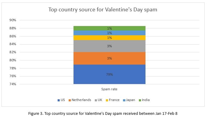 - Οι κορυφαίες πηγές IP για την αλληλογραφία spam με θέμα τον Άγιο Βαλεντίνο που ελήφθη περιλαμβάνουν τις ΗΠΑ, την Ολλανδία και το Ηνωμένο Βασίλειο (Σχήμα 3)
